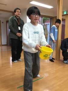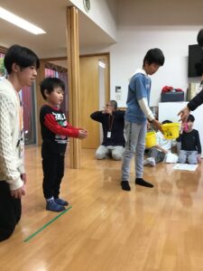 高学年のお兄さんたちが投げ方を教えてあげながら、