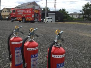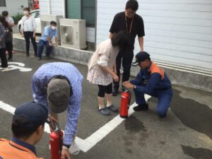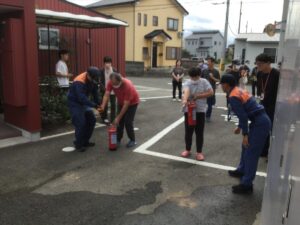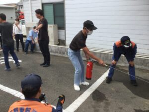 消防の方に消火器の使い方を教えていただきながら、水が入った消火器を実際に使って火を消す訓練をします。